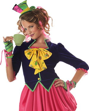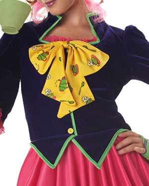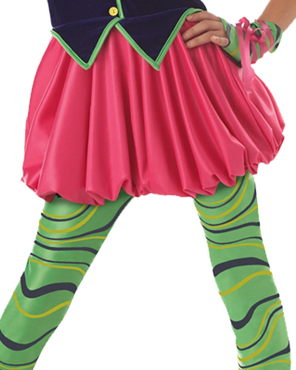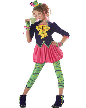 It's time for tea! Dress in the Mad Hatter Tween Girls Costume, ready for a lovely tea party with the white rabbit and Alice. This Mad Hatter tween costume is a funky bright representation of the Mad Hatter from the loveable story, Alice in Wonderland. Costume comes with a dress with a bubble pink skirt, purple bodice styled like a jacket with green edging and a bright yellow neck tie. A pair of funky lime green tights with purple and yellow swirls, matching fingerless glovelettes and blue velvet shoes covers with yellow buttons styled like a pair of Victorian shoes for an extra touch. The Mad Hatter wouldn't be complete without his trusty top hat, so pop the lime green mini top hat with purple and yellow swirls for the finishing touch. Grab your favourite tea cup and pour in your favourite brew.