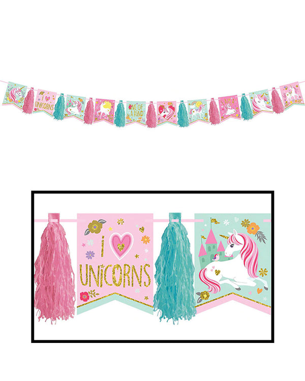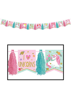 Decorate your little girl's unicorn themed birthday party with this gorgeous Magical Unicorn Tassel Garland! This garland features pennants printed with unicorn motifs and tassels in both pink and blue. Combine with other products from our Magical Unicorn party supplies range for a coordinated look!