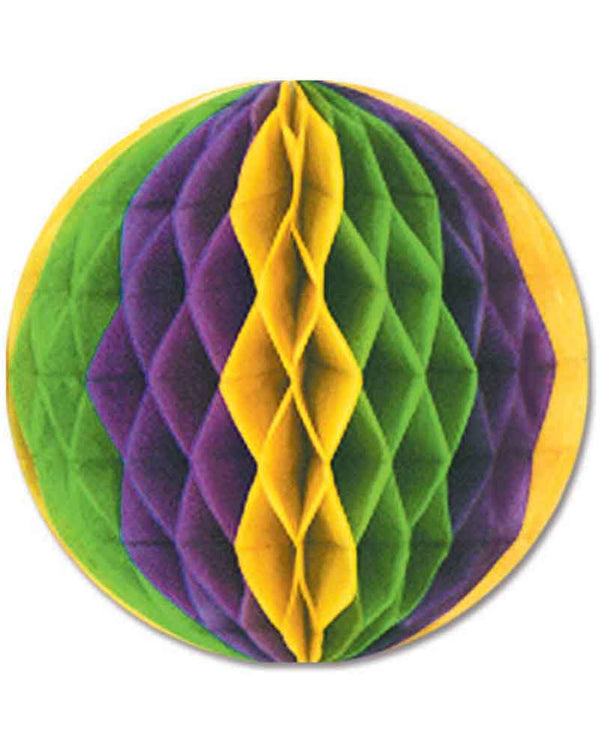 Decorate your celebrations with this colourful Mardi Gras Tissue Ball. This ball is made from yellow, purple and green honeycomb tissue. Each tissue ball contains a string for easy hanging. Match up with our other Mardi Gras party supplies and accessories for a co-ordinated party look.