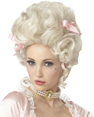 Let them eat cake.Be the gorgeous Austrian who became Queen of France with this Marie Antoinette Classy Blonde Wig. Complete your Marie Antoinette costume and have the most authentic one in the room with this plastinum blonde wig that's styled in a historial updo, with two curls at each temple and adorned with delicate pink bows. Wear a wig cap for added comfort and to keep your own hair under wraps.