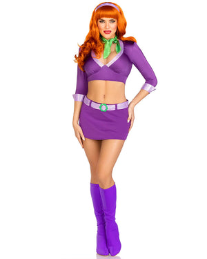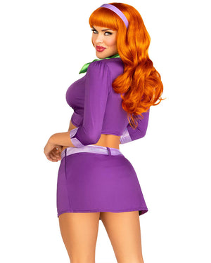 Step into the mystery-solving spotlight with this Meddling Cutie Women's Costume! Embrace your inner detective and channel the iconic style of everyone's favourite member of Mystery Inc. This ensemble features a curve-hugging purple crop top with 3/4 sleeves, perfect for showcasing your charm and confidence. Paired with a matching purple mini skirt featured with a green belt buckle feature, you'll be ready to crack any case in style. The look is completed with the included purple headband and a green silk scarf for a touch of retro flair. Whether you're attending a costume party, cosplay event, or just feeling adventurous, this costume is sure to turn heads and capture the spirit of Daphne from Scooby-Doo. Get ready to solve mysteries and look fabulous while doing it!