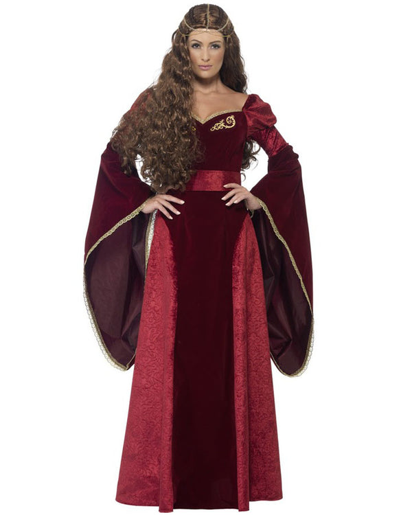 Make an elegant impression with this Medieval Queen Deluxe Womens Costume. The dress is a beautiful burgandy colour with gold embroidered embellishments on the bodice and long bell sleeves with an attached belt to define the waist. A gold coloured headpiece is included to complete the look.