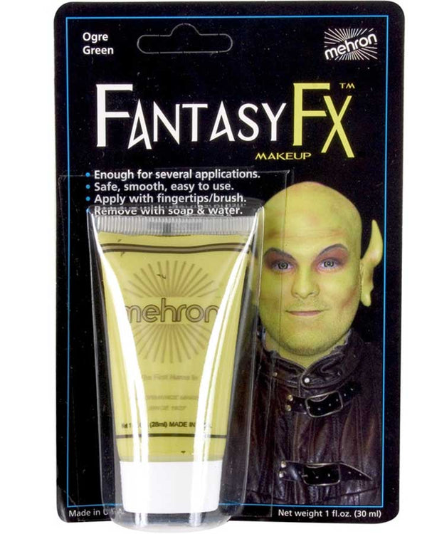 Add some character to your costume with this Mehron Ogre Green Fantasy FX Makeup 30ml. Mehron Fantasy FX paints are water-based, highly pigmented and made up of soft cream makeup in a plastic squeeze tube. Great for year-round face painting and sporting events. Apply with sponge, brush or fingertips to skin or hair. Remove with soap and water