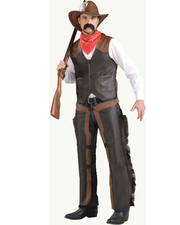 Transform your outfit with this Mens Cowboy Vest and look like you've just stepped out of the Wild West. Faux leather two tone button up vest or waistcoat cowboy style. Add your own jeans, a hat and bandana and you're there. Nice and easy for your next dress up party.