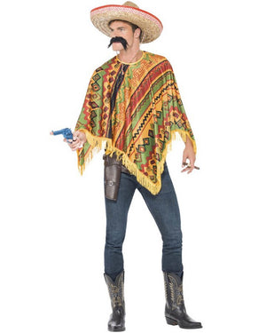Tame the Wild West or prepare for a fiesta with the Mens Mexican Poncho and Moustache Kit. This pack comes with a brightly coloured poncho with fringe detailing, and an adhesive black moustache. Just add a sombrero, pants, cowboy boots, and a gun to complete the outfit.