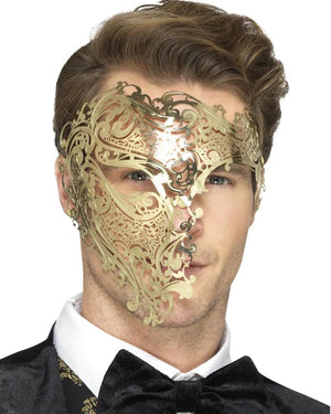 Wear this Metal Filigree Phantom Deluxe Half Mask to your next masquerade ball and keep your identity a mystery. This truly beautiful eye mask comes in gold metal with an intricate filigree design. One side of the mask covers your eye area and on the other, it sits just above your eyebrow. Wear this mask to match your outfit or use it as a starter for your costume.