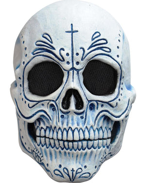 Scatter marigold petals for loved ones wearing this Mexican Catrin Day of The Dead Deluxe Mask. A great mask to wear for Halloween as well, this latex mask is in the shape of a white skull and is painted blue with intricate patterns, designs and shapes around the front. Along the sides is blue shading with sections of the skull painted black for where there should be gaps. For you to be able to see, there is black mesh inside the eye sockets. To complete the look, pair this latex mask with our range of Day of the Dead accessories and costumes.