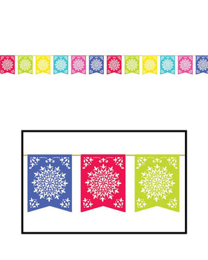 Decorate your next fiesta with colour! This Mexican Fiesta Sun Print Flag Banner is just the thing to add some bright colour to your next Mexican party. This Banner features traditional Mexican cut paper with the signature Del Sol solar design in festively colored tissue paper.