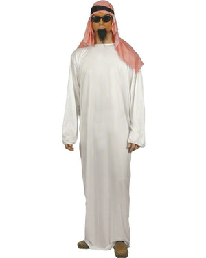 Simple yet effective Middle Eastern Mens Costume featuring a full length white robe and red and white check headdress with black band. Add a moustache or goatee and glasses and you're all set. Great couples costume with one of our Arabian style women's costumes.