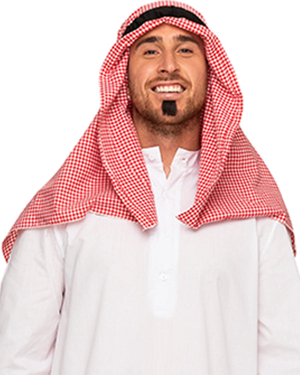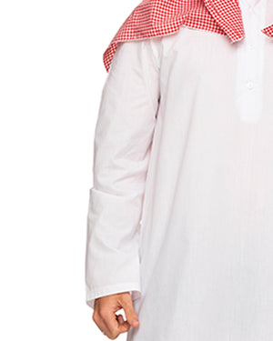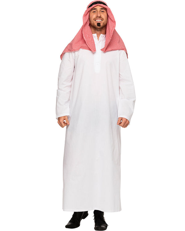 Get ready for some hot Arabian nights in our fantastic Middle Eastern Robe Deluxe Mens Costume! Great for your next International, Arabian or Middle Eastern themed fancy dress parties. This deluxe costume comes with a full-length long white robe that features a stand up collar and buttons all the way down to the chest. Your Middle Eastern costume wouldn't be complete without the included shoulder-length headdress to keep the sand, dust and scorching sun off of your face and neck. The headdress features a red and white checkered print and is held in place around the head with the attached black band. Simply pair this costume with a pair of sunglasses, a goatee and some sandals and you're all set to party until the desert sun goes down.