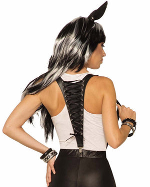 Complete your dark and mysterious outfit when you strap on these Midnight Menagerie Suspenders. These badass suspenders will really have you looking like the darkest vampiress around. Just like regular suspenders there are 3 clips; 1 in the back and 2 in the front. In the back is the main feature, there is black lace up ribbon corset style with silver eyelets. Is made of black looking faux leather. Pair up with a pair of black leather boots and leather outfit and strut the party, bring out your rebellious side.