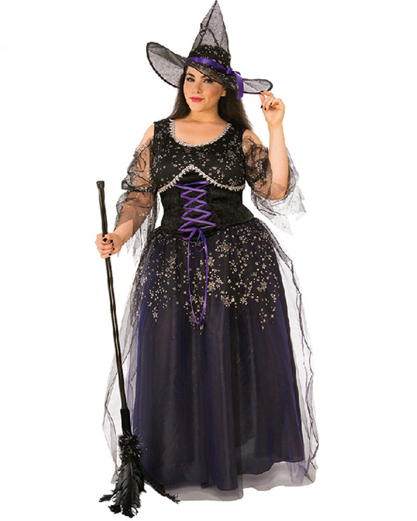 Cast a spell that is permanent when the clock strikes midnight while wearing our Midnight Witch Womens Plus Size Costume. Imagine this Halloween you're stirring your witch's cauldron and taking a ride on your witches broom with your coven at the dead of the night! Featuring a spooky purple and black ankle length women's dress with a black satin bodice with crossover purple ties and black tulle material with a gold trim! Also featuring a classic black witch's hat with a gold trim and a purple ribbon! Finish off the costume with a witches broom, wand and wig! Making for a perfect fancy dress idea for attending a witch's coven party this Halloween!