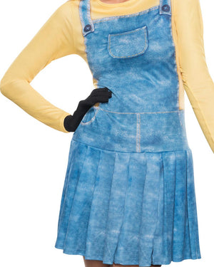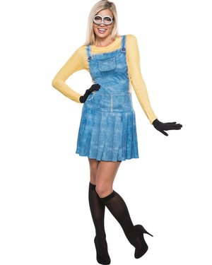 Have some fun in this Minion Womens Costume, a female version of the little guys from the hit movie Minions featuring Dave and Stu! Our costume features a blue denim look dress with yellow sleeves and black gloves and socks with a pair of silver framed plastic goggles. Totally bananas!