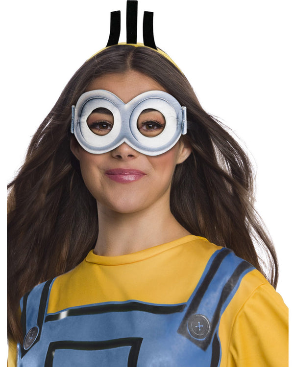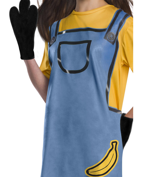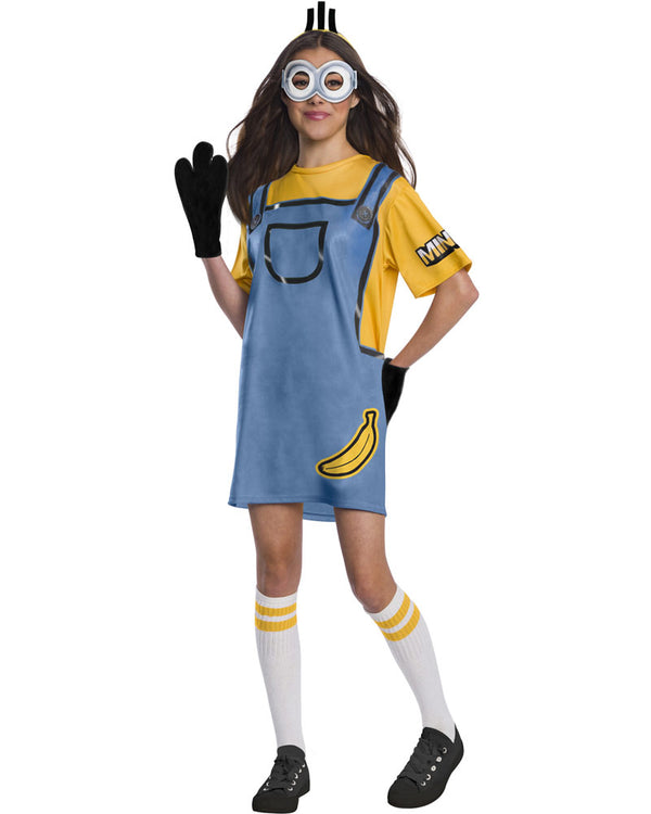 Be Gru's number one minion in this Minions The Rise Of Gru Minions Oversized Teen Shirt. The costume is a digitally printed oversized dress with short sleeves and printed overalls with a printed banana at the bottom and the Minions logo on the right sleeve. Also included with this costume is a printed die-cut goggle mask with an elastic strap to secure in place around the back of the head, a pair of black fabric gloves with three fingers, and a headpiece featuring three tufts of hair. Perfect for helping rule the world with the number one supervillain - Gru!