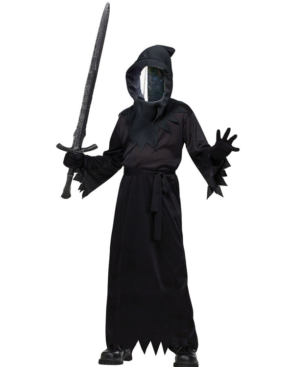 This Mirror Ghoul Horror Boys Costume is brilliantly simple, a ragged edged hooded black robe, long sleeved and down to the ground, with a pair of gloves, a belt and the crowning glory (so to speak) is the mirrored mask. Simply spooky! Perfect for Halloween.