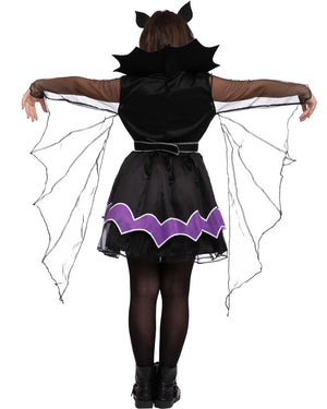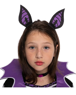 Transform into the queen of the vampire bats with this super cute Miss Batiness Kids Costume. The costume comes as a black dress with purple bat wing detailing at the collar and peplum, a purple corset-like bodice and a layered black tulle skirt. The dress also features sheer black long sleeves with attached sheer bat wings so you can soar through the night sky like any vampire bat. Top off the costume with the included black and purple bat ears headband. Perfect for Halloween or animal fancy dress parties.