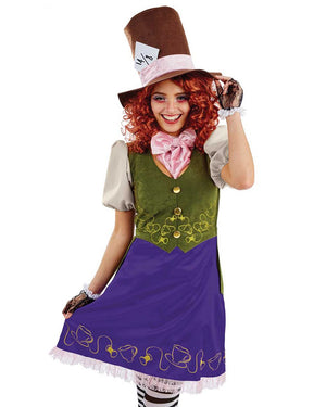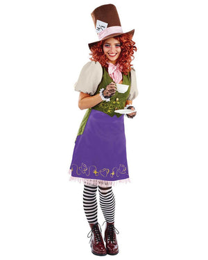 Travel to the wonderland full of wacky and uniquely mad characters with this Miss Hatter Women's Costume. Inspired by the magical wonderland we all love, this is a carefully designed costume that misses no details. Included is a tall hat, multi layered dress, lacy gloves and neckpiece to tie this costume together. Bring the insanity to the tea party, or have it come to you! This outfit is guaranteed to bring laughs and enjoyment your way. Be the flavour and the eye of the party, it's impossible to miss this costume. Perfect for Tea parties, Themed parties and much more.