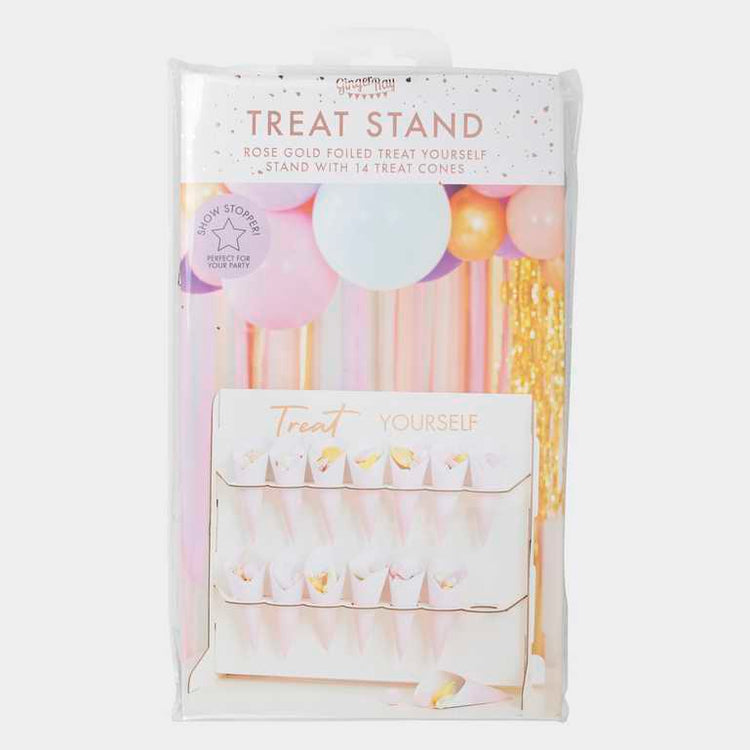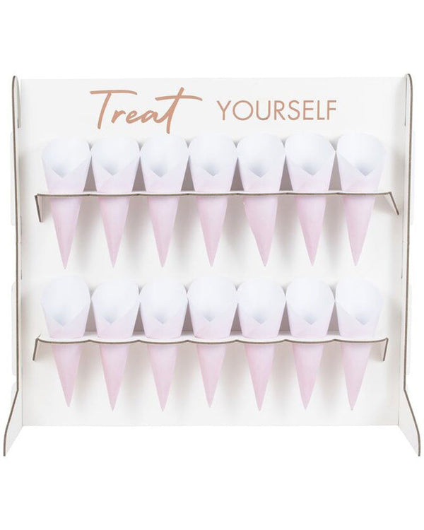 For your Birthday you'll love our Mix It Up Food Cones Treat Yourself Stand. Featuring a Treat yourself food cone stand styled in gorgeous rose gold writing and of course 14 pink food cones great to fill with sweet or savory treats. Great to be used in combination with our Mix it up Donut and prosecco stands!