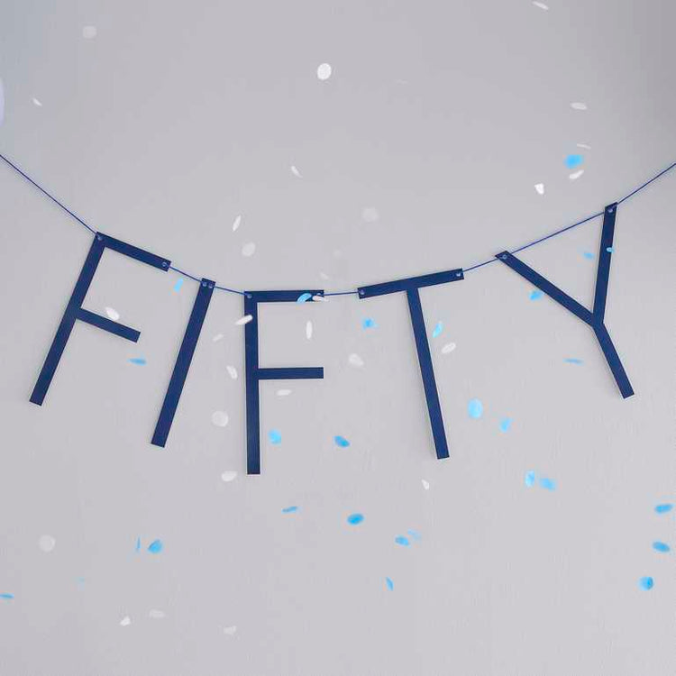 Shipped by our trusted partnerEach pack contains 1 x Happy Birthday Bunting with 'FIFTY' bunting, 24 navy, grey and blue balloons and 1.5m of navy twine, 3m of paper balloon tape and 20 glue dots.