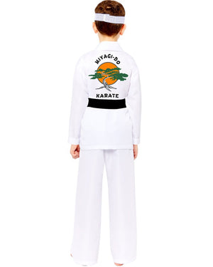 Prepare for battle in this Miyagi Do Karate Kids Costume. The costume includes a long sleeve white top and matching white pants, just like a traditional karate outfit. Also included is a black karate belt to show off your mastery in the art of karate, and blue and white headband, just like the one Mr Miyagi gives Daniel to wear. Even better, the back of the costume features a printed "Miyagi-do Karate" tree emblem on the back. Perfect for 80s parties, karate-themed parties or for your little one to practise their skills around the house.