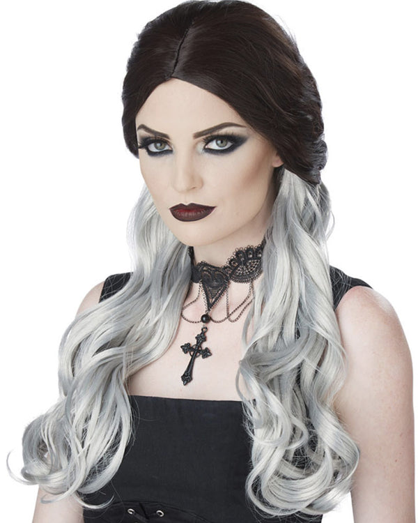 Complete your seductive look with this Morbid Mistress Black and Grey Wig. The long wig features a black top half swept into a short ponytail with curled grey ends. Perfect for a gothic vampire look. Wear a wig cap for added comfort and to keep your own hair under wraps.
