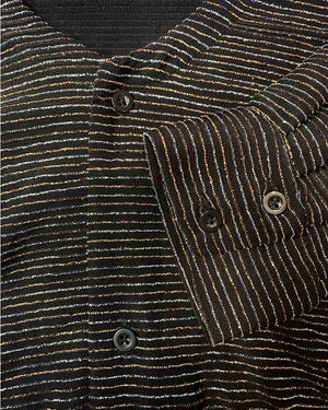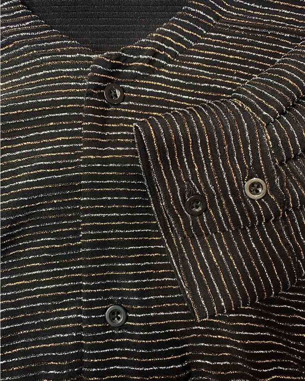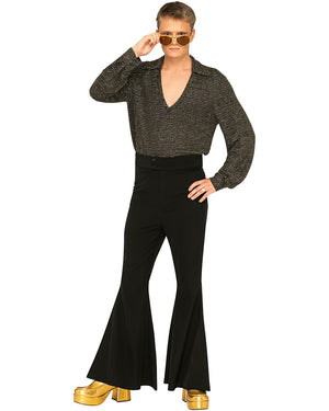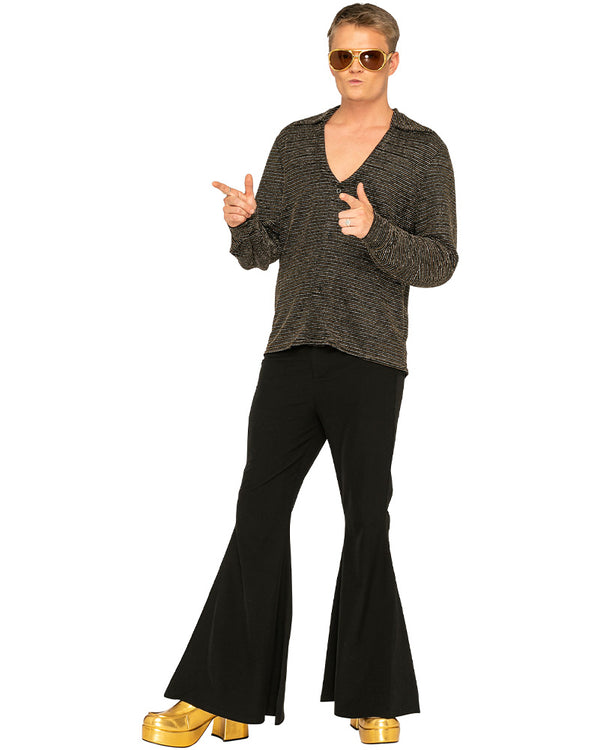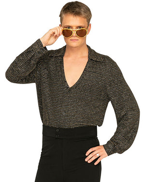 You can dance, you can jive in this nifty Mr Disco Black Shimmer Mens Shirt. Included is a long-sleeve, V-neck collared shirt in black, with silver and gold horizontal stripe details. The metallic stripes reflect light, taking this black shirt from understated to dance-floor in a flash. This item has been designed and made exclusively for CostumeBox, which means you won't find it anywhere else. Perfect for any 70s themed or disco dance parties on your calendar! Complete the look with gold, silver or black pants and your dancing shoes.