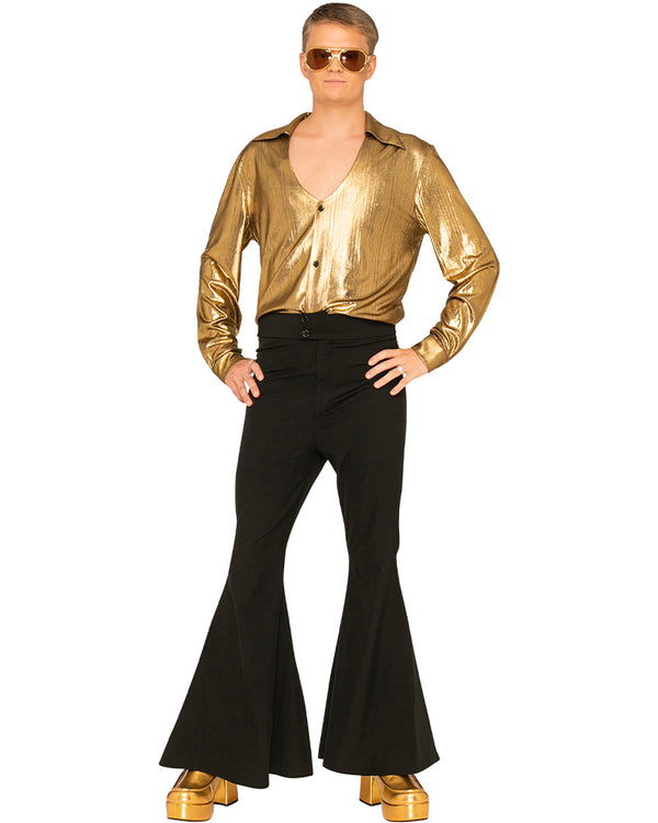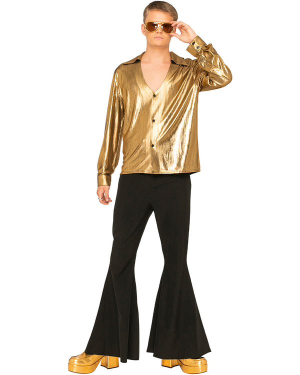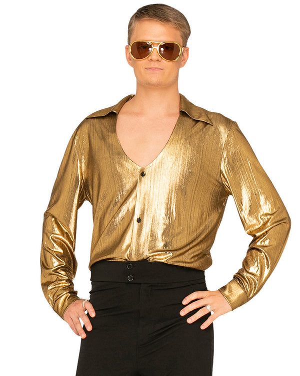 Be the Dancing King in this completely off the hook Mr Disco Golden Mens Shirt. Included is a long-sleeve, V-neck collared shirt in metallic yellow gold. Fabric has some stretch and falls effortlessly, making you look disco-ready! This shirt is a CostumeBox Exclusive, which means you won't find it anywhere else. Perfect for any 70s themed or disco dance parties on your calendar. Complete the look with flares or overalls and your dancing shoes.