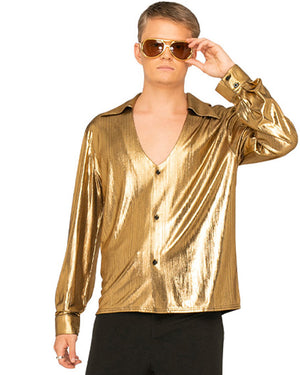 Be the Dancing King in this completely off the hook Mr Disco Golden Plus Size Mens Shirt. Included is a long-sleeve, V-neck collared shirt in metallic yellow gold. Fabric has some stretch and falls effortlessly, making you look disco-ready! This shirt is a CostumeBox Exclusive, which means you won't find it anywhere else. Perfect for any 70s themed or disco dance parties on your calendar. Complete the look with flares or overalls and your dancing shoes.