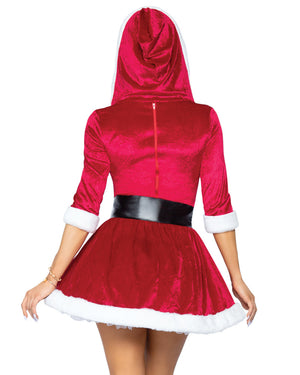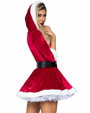 Celebrate Christmas in style in this gorgeous Mrs Claus Womens Costume. This costume comes with a red velour dress with white faux fur trim around the neckline, cuffs, bottom of the dress and the attached hood. A black belt with a gold buckle is also included to complete the festive look. Happy holidays!