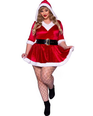 Celebrate Christmas in style in this gorgeous Mrs Claus Womens Plus Size Costume. This costume comes with a hooded red velour dress with white faux fur trim around the neckline, cuffs, bottom of the dress and the attached hood. A black belt with a gold buckle is also included to complete the festive look. Happy holidays!