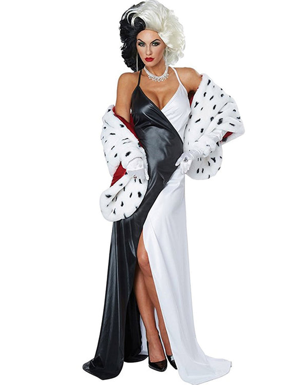 A costume reminiscent of Disney's Cruella De Vil from 101 Dalmations, this Ms Cruel Diva Womens Costume will make you love being bad. The costume is a half-black, half-white dress with a split leg up the thigh, and comes with a beautiful fluffy red-lined faux fur stole that will have you loving spots as much as she does. Perfect for villain-themed parties, Halloween events and more.