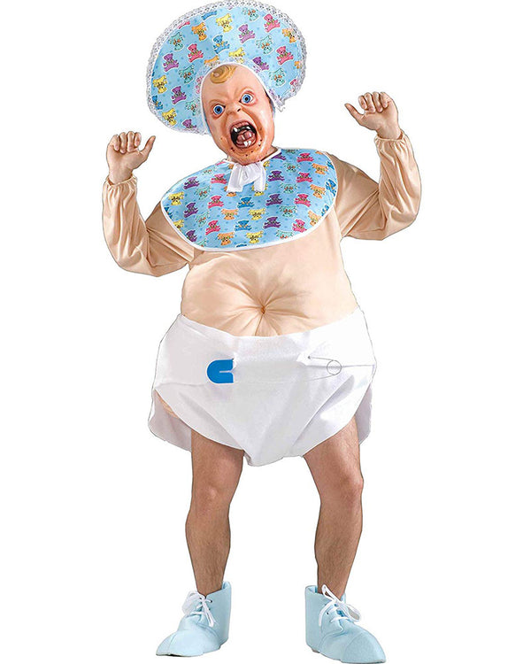 The terrible two's start here with this costume. Costume includes mask, bonnet, stuffed baby suit with attached bib and diaper.