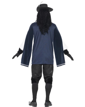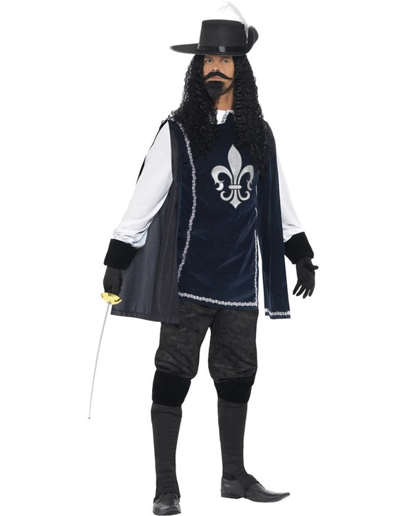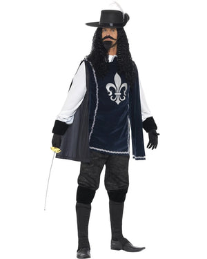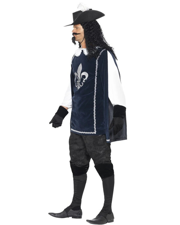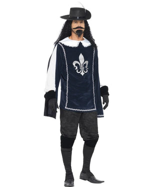 Round up your friends and join the musketeers in this Musketeer Mens Costume. The costume includes a top white long sleeves and collar and an attached dark blue velvet vest with large silver Fleur De Lies design and silver trimming. The top also features two attached blue velvet flowing sleeves that are open. Also includes is a black hat with turned up brim on one side and attached white feather, as well as a pair of black gloves, black boot covers and thick black moustache and goatee.