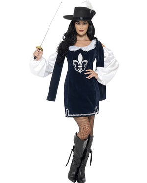 Why should the boys have all the fun? This Musketeer Womens Costume includes a long sleeved dress with white puff sleeves and a navy blue pinafore featuring a silver fleur de lis and silver trimming on the hem. A hat with a white feather is also included to finish off the costume with style.