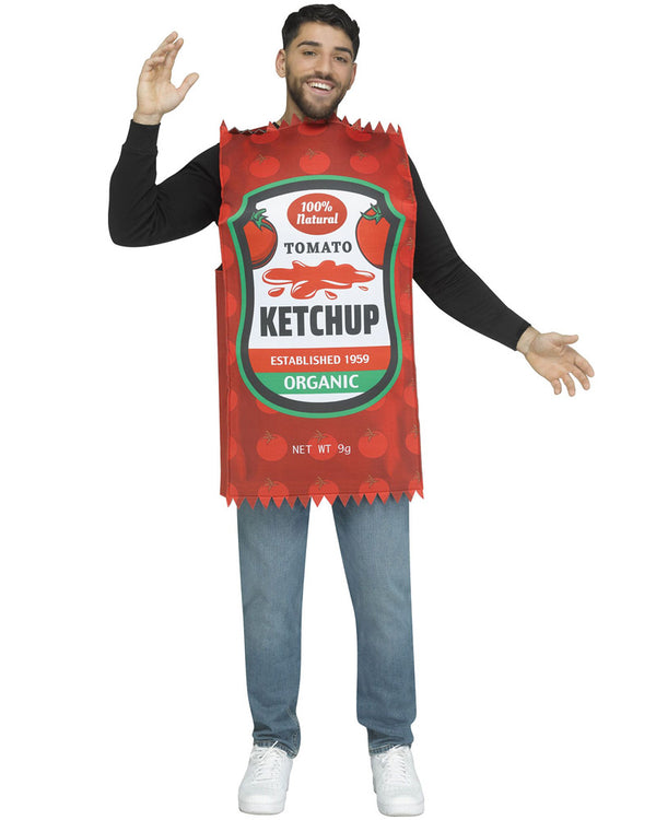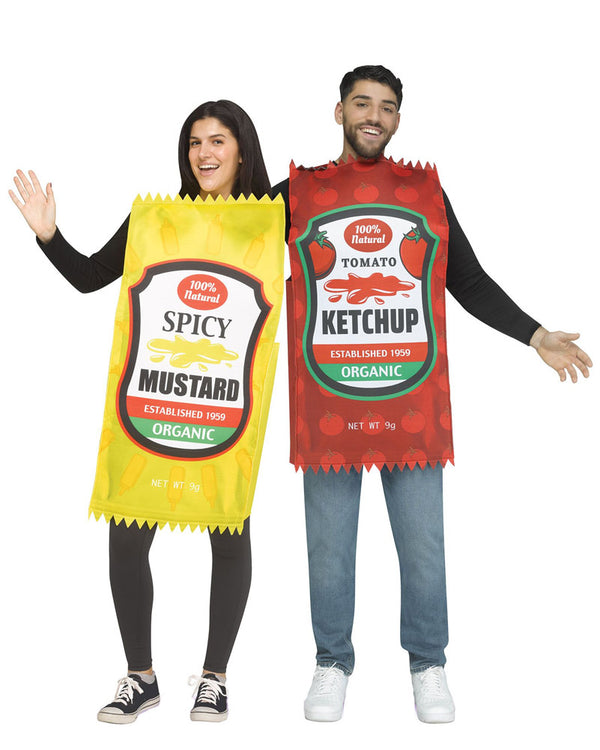 There’s nothing more romantic than this Mustard and Ketchup Adult Couple Costume. Featuring two tunics, one has a red ketchup packet design with logo and graphics on the front, while the other has a yellow mustard packet design with logo and graphics on the front. The tunics have holes for your arms and neck, along with an open base for comfort and easy all day wear. Now all you need is the ketchup to your mustard. A fun costume to wear as a pair to your next food and drink themed party, or for Halloween.