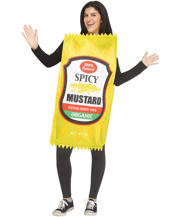 - Yellow mustard packet tunic with logo and graphics on the front.