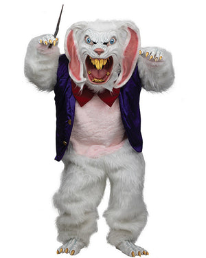 Nasty Bunny Mega Collectors Mens Costume, perfect to terrify Easter Lovers! The crazy bunny has escaped this Halloween to trick-or-treat and party! This costume has been carefully designed, while being 100% hand made! The featured mask, claws and feet have been hand crafted from 100% Biodegradable Latex, creating a freakishly realistic look with huge evil teeth, a large open mouth and long hanging bunny ears, whilst the overall and bow tie have been hand crafted from 100% polyester to keep the realistic effect of the outfit at large. This costume is a complete package. Perfect for Costume parties, Easter parties, Halloween and much more!