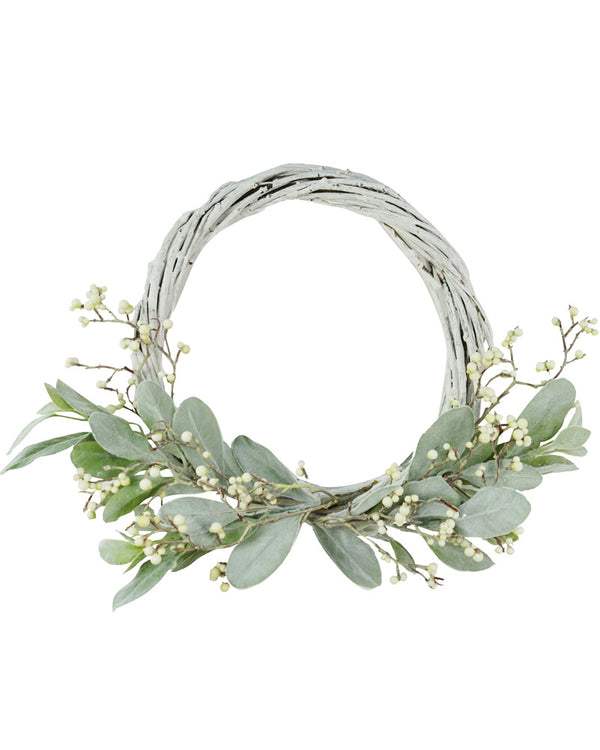 Complete your festive decorations with this Native Berries Half Wreath 45cm. Included is a 45cm wreath with grey woven twig detail with light green leaves and white berries on the bottom half of the wreath.