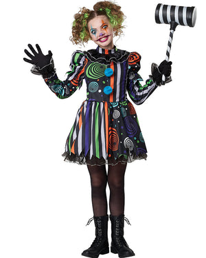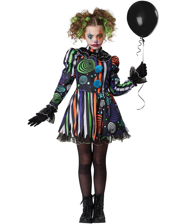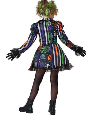 You'll be in your friend's worst nightmares this Halloween when you wear our Neon Nightmare Clown Deluxe Girls Costume. The nightmarish costume features a twisted neon dress with long sleeves and frilly cuffs, plus 2 blue fluffy buttons. The costume comes complete with a ruffled clown collar.