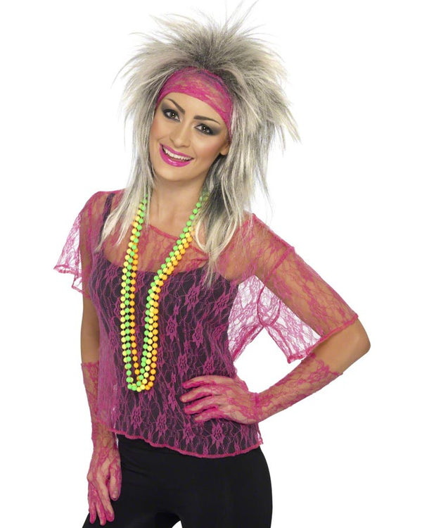 Add some colour and fun to your next outfit with this Neon Pink Lace Net Vest. This great 80's inspired look comes with matching gloves and headband. Add some funky beads and accessories and you will be ready to groove along to the sweet 80s beats.