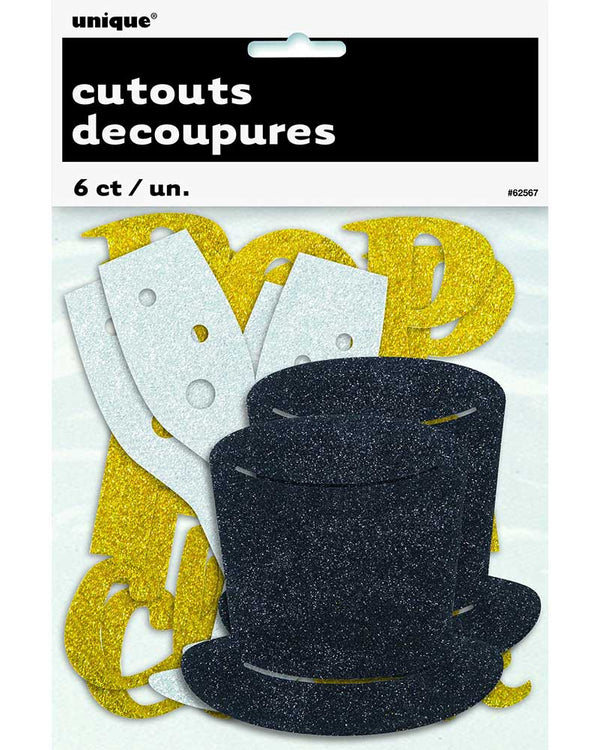 Set the scene for your New Year's celebrations with our New Year Mini Glitter Cut outs Pack of 6. The party supply features a park of 6 glittered party supplies including black top hats, silver sparkling wine glasses and Pop Frizz Clink cutouts! Just stick them on your wall or hang up for a fantastic New Year's Eve décor idea. Check out our range of New Year's party supply range to make your night a special one! Be sure to cheers to the New Year with Champagne in hand!