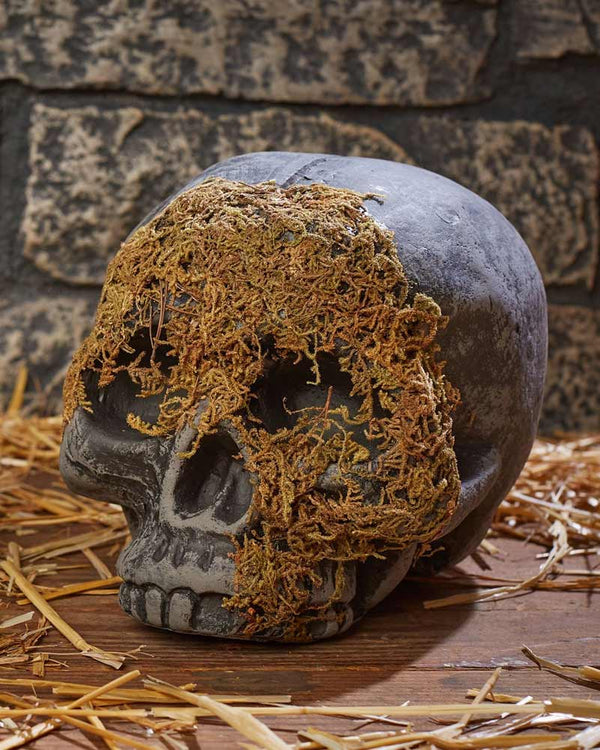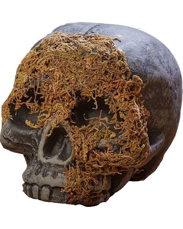 This No Jaw Moss Covered Skull would be the perfect addition to any graveyard themed Halloween decor. The skull is a grey colour, is missing a jaw and has faux green moss covering the front of the face.