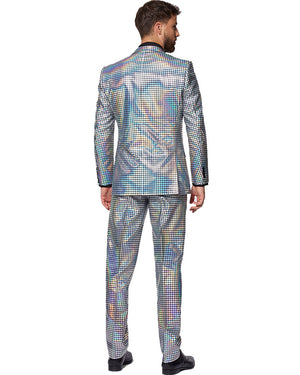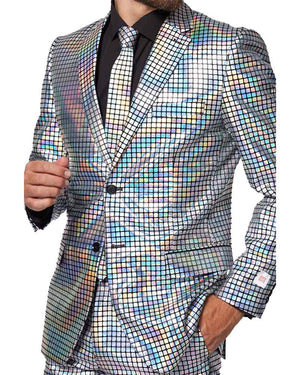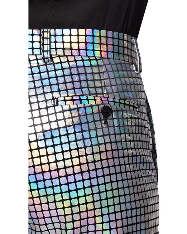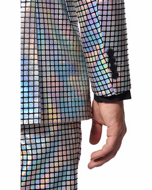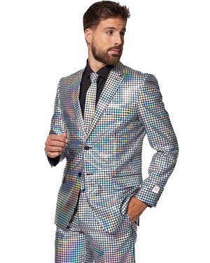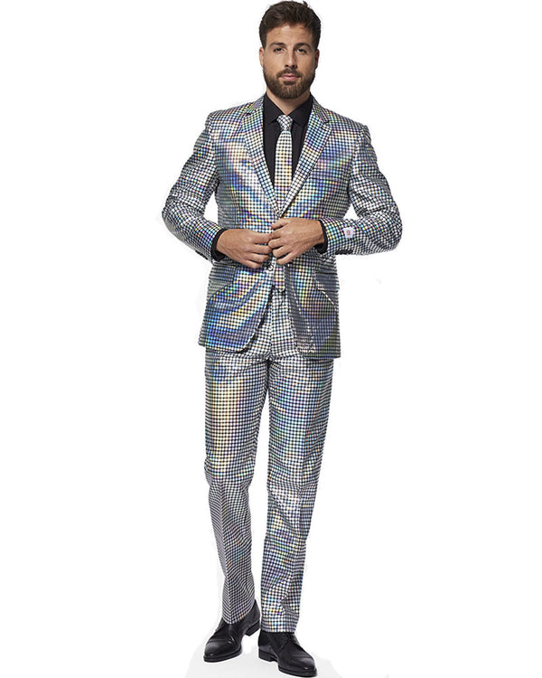 If your unsure about a 70s costume you can't go wrong with our slim fit Opposuit Discoballer Premium Mens Costume. The high quality opposuit featuring a suit quality fully lined blazer with 2 front pockets, 4 inside pockets, padded shoulders a double vented back, notched lapels and styled with mirror patches. The opposuit comes complete with disco ball styled trousers with two back buttoned pockets and 2 side pockets plus a matching tie. If you’re unsure about sizes we recommend picking the larger size of the two suits as they come in a slim fit. All Opposuit pants and jackets are lined with a small amount of additional fabric so that if desired, they may be tailored to your exact length and fit by an alterations business or tailor. Also, the waistband of trousers can be adjusted 2 sizes larger or smaller than the original size.