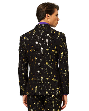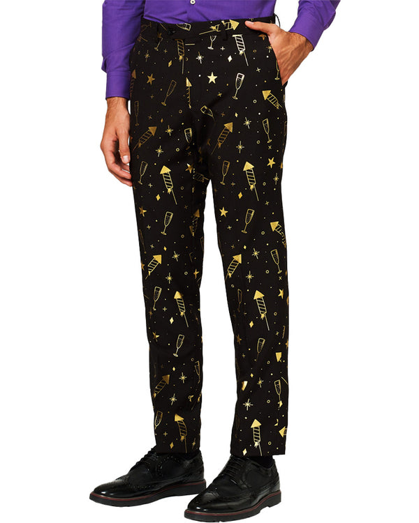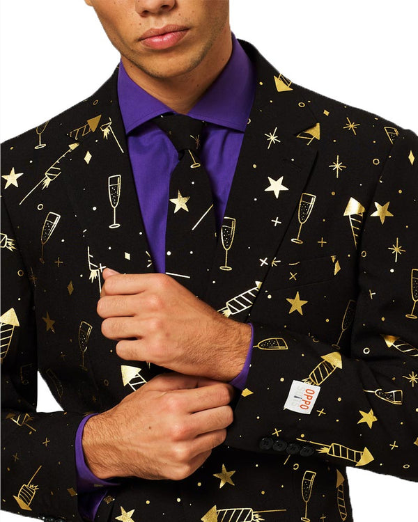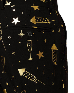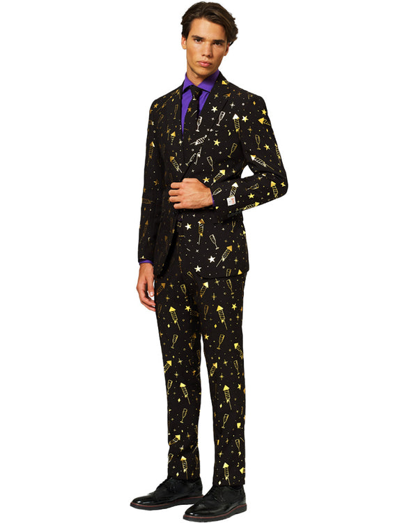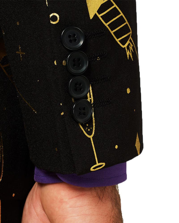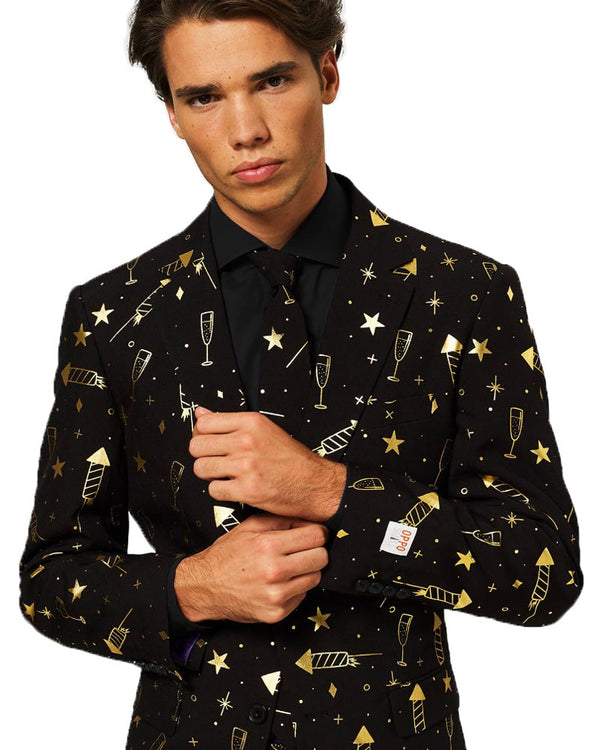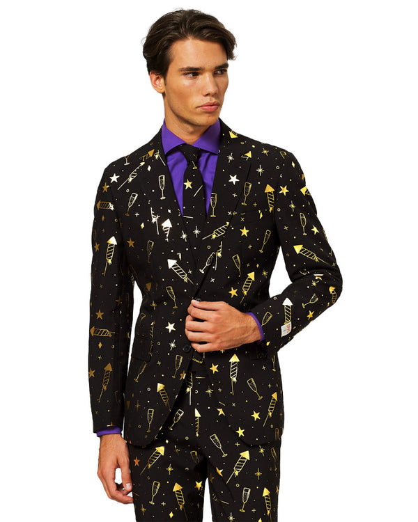 Show up in style and get ready to pop the champagne with this Opposuit Fancy Fireworks Premium Mens Suit. Included is a full-length, three-piece suit in a festive metallic gold print of stars, fireworks and champagne glasses. Jacket is fully lined, with notch lapels, padded shoulders, two-button front closure, and four-button cuffs. Trousers feature belt loops, two side pockets, two back button-through pockets, and a zip fly with hook and button closure. This premium quality suit will have you ready to celebrate day or night, a fun twist on a classic black suit fit for any event.
