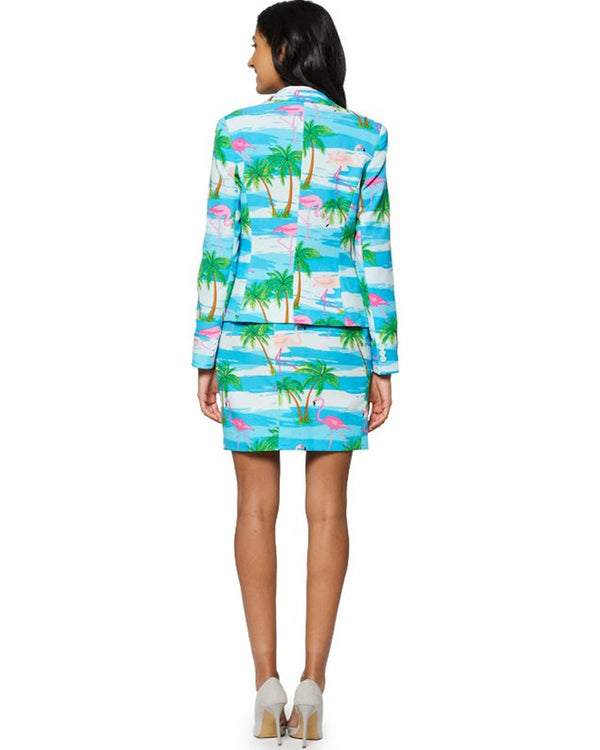 Stand out from the crowd in this Opposuit Flamingirl Premium Womens Suit. Included is a blue, white and green tropical printed jacket and skirt with pink flamingoes dotted throughout. The jacket has 1 Inside pocket, Back slit, Front flap pockets, Fully lined, Padded Shoulders and the skirt has elastic panels on either side.