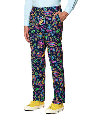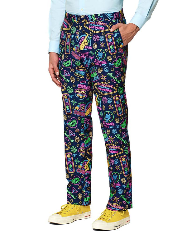 Dress to impress with our fitted Opposuit Mr Vegas Premium Mens Suit. Featuring a dark blue opposuit styled with an array of iconic neon lights of Vegas. Made to a high quality the opposuit itself features a fully lined jacket with notch lapels, two front flap pockets and inside pockets, the matching trousers including 2 side pockets and 2 buttoned back pockets! Awesome for dressing up as for Poker Night or spring racing special occasions! If you're unsure about sizes we recommend picking the larger size of the two suits as they come in a slim fit. All Opposuit pants and jackets are lined with a small amount of additional fabric so that if desired, they may be tailored to your exact length and fit by an alterations business or tailor. Also, the waistband of trousers can be adjusted 2 sizes larger or smaller than the original size.