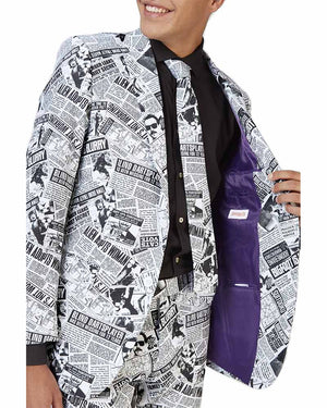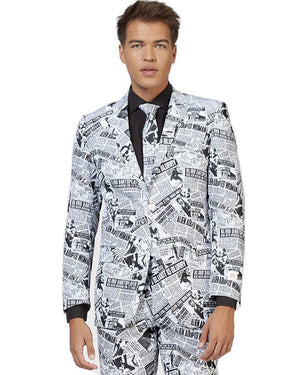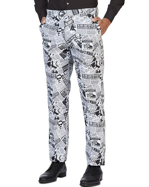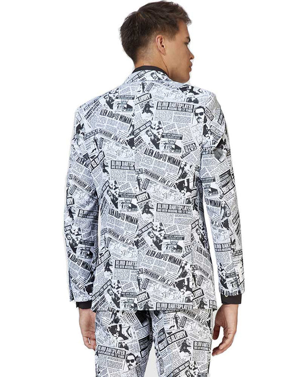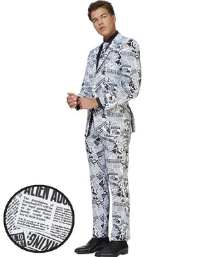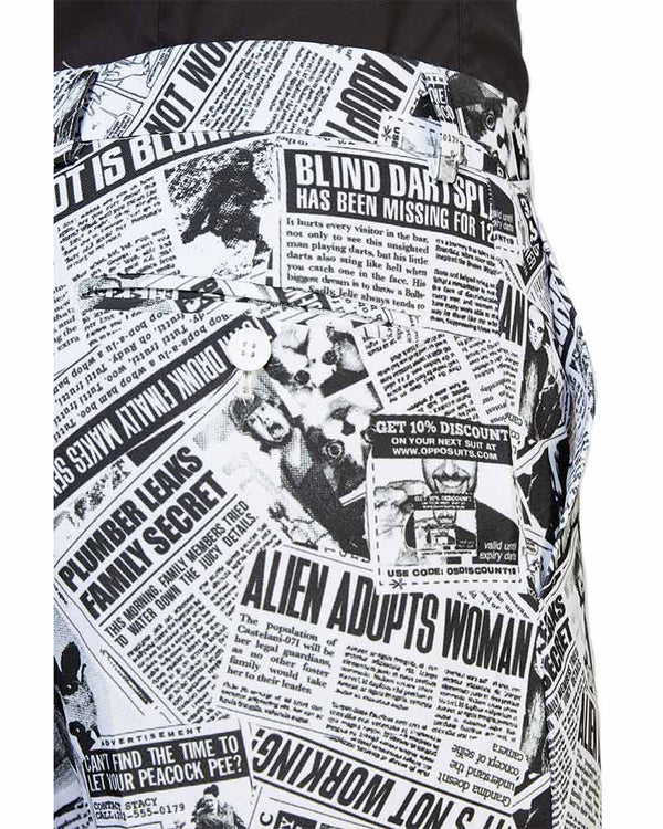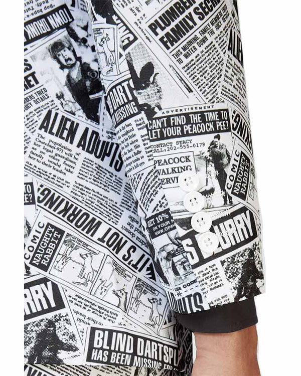 Look your best in our Opposuit Textile Telegraph Premium Mens Suit. Made from a high quality suit material the opposuit features a fully lined jacket with notch lapels, two front flap pockets and four inside pockets, what's more, the matching trousers including 2 side pockets and 2 buttoned back pockets! Designed with a collage of black-white hilarious newspaper headlines including "Alien adopts women" and "blind darts player has been missing for 12 years!". If you're unsure about sizes we recommend picking the larger size of the two suits as they come in a slim fit. All opposuit pants and jackets are lined with a small amount of additional fabric so that if desired, they may be tailored to your exact length and fit by an alterations business or tailor. Also, the waistband of trousers can be adjusted 2 sizes larger or smaller than the original size.