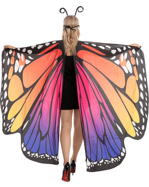 Fly your way through the flowers wearing this stunning Orange and Purple Butterfly Wing Cape and Antenna Headband Set. This set comes with wings in a satin like fabric with orange, purple and pink butterfly wings with black detailing printed on both sides. To show them off there are finger loop ties on the ends and around the neck. The set also includes a black velvet headband with attached curling antennas. Raise your arms up to the skies and show off the amazing bright colours of these wings at your next fancy dress or festival.