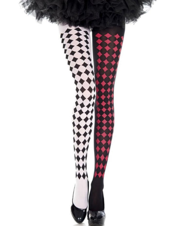Whether they're for a dress-up party or another addition to the wardrobe the Pantyhose Mismatch Harlequin Black Red White are sure to make an impression! One leg is white with black diamonds and the other leg is black with red diamonds.