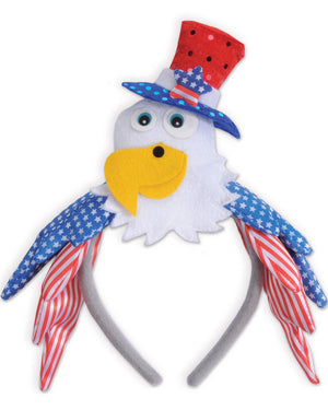 Show your love for the motherland with this Patriotic Eagle Headband. Included is the head of an eagle wearing a red, blue and white hat and stared and striped wings. The eagle is attached to a snap-on headband and is designed to look like he is sitting on your head!